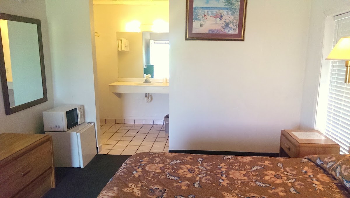 This little Motel may not look great from the outside but it was absolutely wonderful. The rooms were clean and smelled nice, even with offering smoking rooms. They accepted pets for a $10 fee. There was a mini fridge and a microwave a nice little TV with plenty of channels. There was a good size dresser and freestanding closet rack. The bathroom was very nice and I absolutely loved the shower. Wonderful water pressure wonderful water temperature. The on-site maintenance guy was very nice and accommodating. And the price was just right as well.